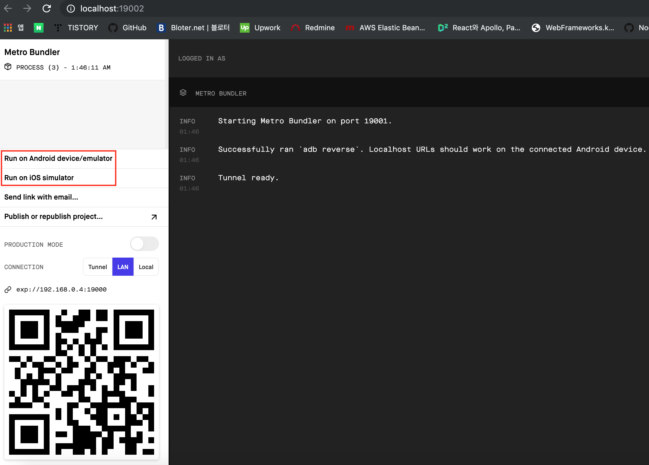 위 코드 실행시 웹페이지에서 expo용 개발서버가 실행됩니다.