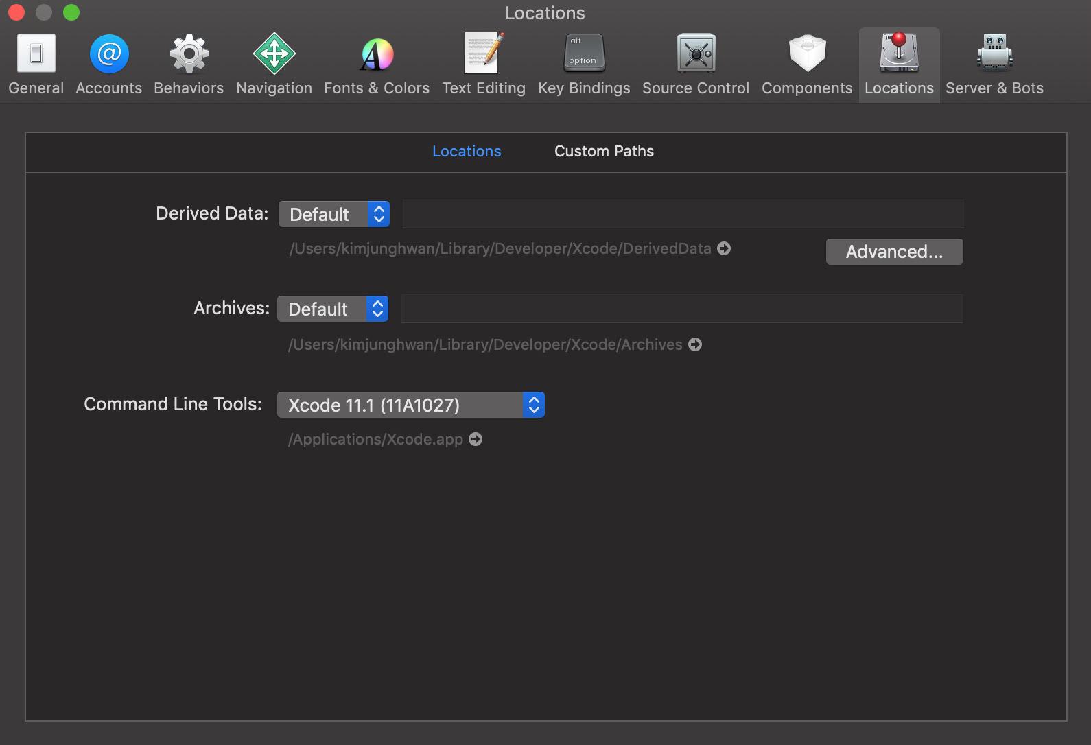 Preferences -> Locations -> Command Line Tools에서 Xcode 최신 버전을 선택합니다.